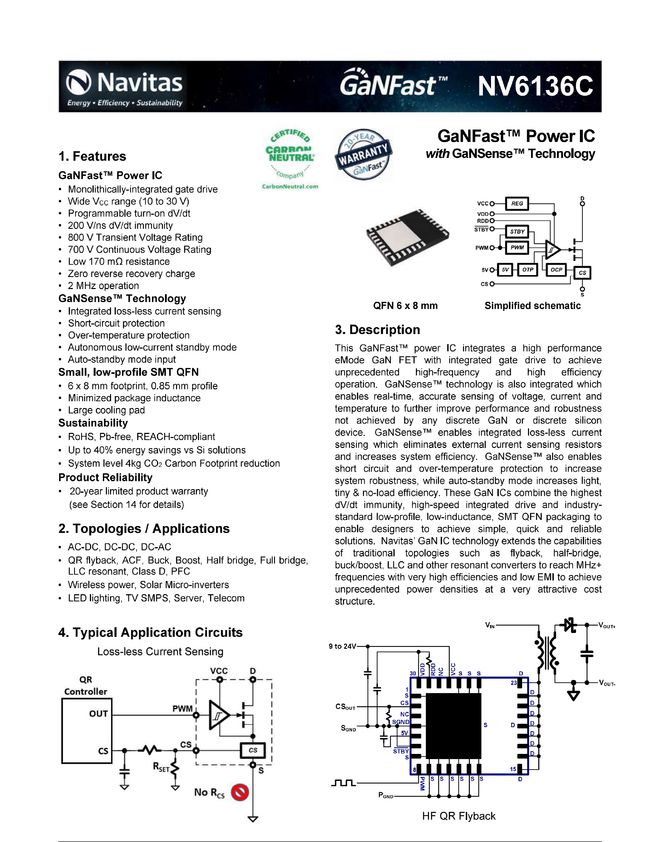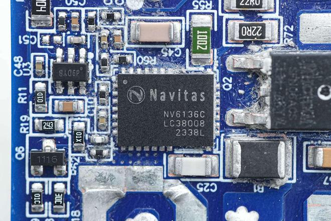 PFC开关管来自纳微,型号NV6136C,这是一颗高集成的氮化镓功率芯片,内置驱动器以及高精度无损耗电流采样电路,消除取样电阻的损耗。NV6136C内置170mΩ导通电阻,耐压700V的氮化镓开关管,支持2MHz开关频率,采用6*8mm QFN封装,节省面积。
