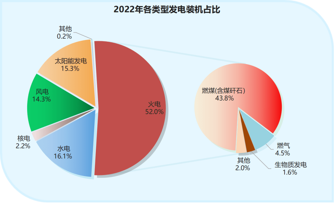 2022年,我国煤电占总装机容量的43.8%,水电占16.1%,太阳能发电占15.3%,风电占14.3%,凯发k8娱乐官网app下载核电占2.2%,生物质发电占1.6%。
