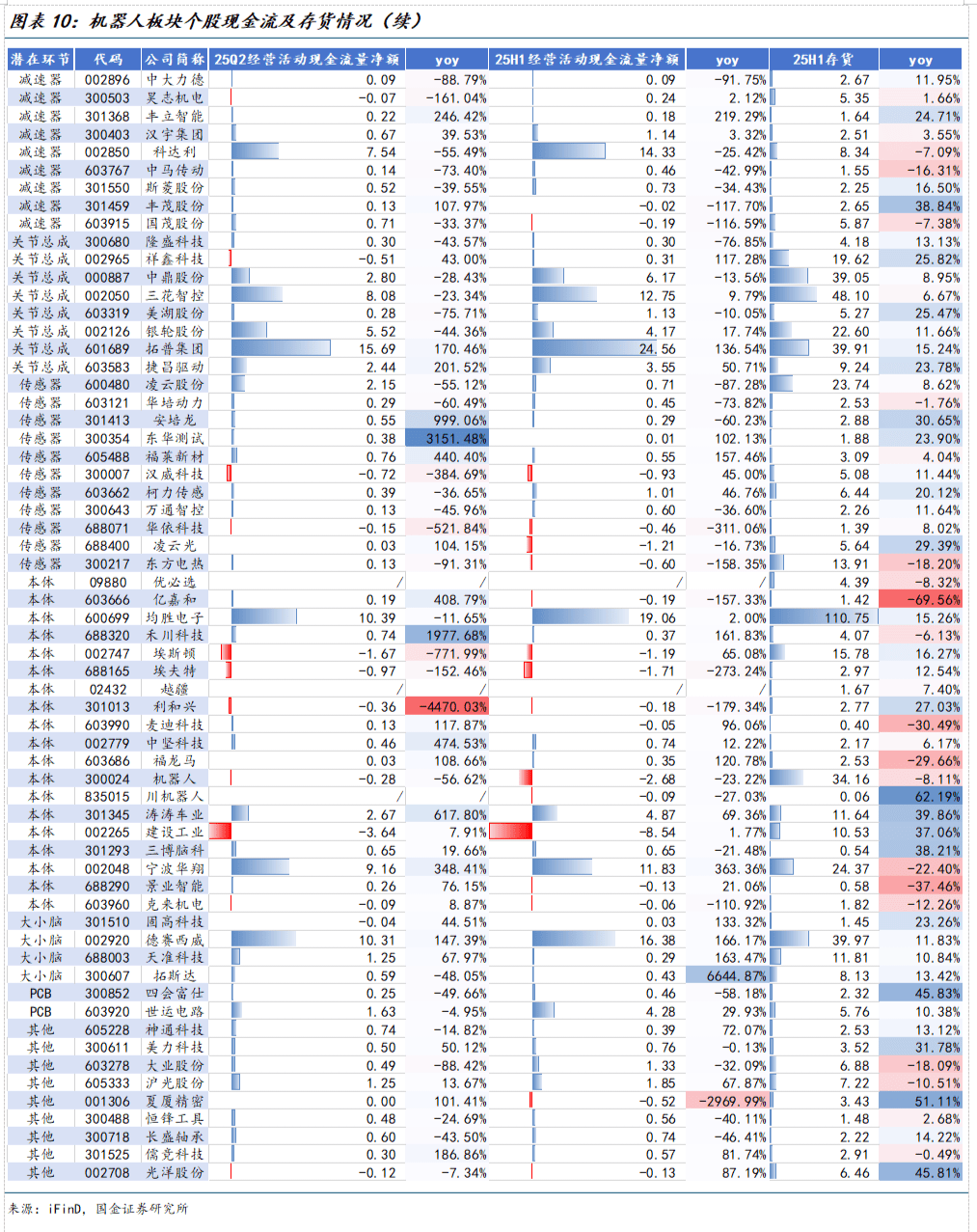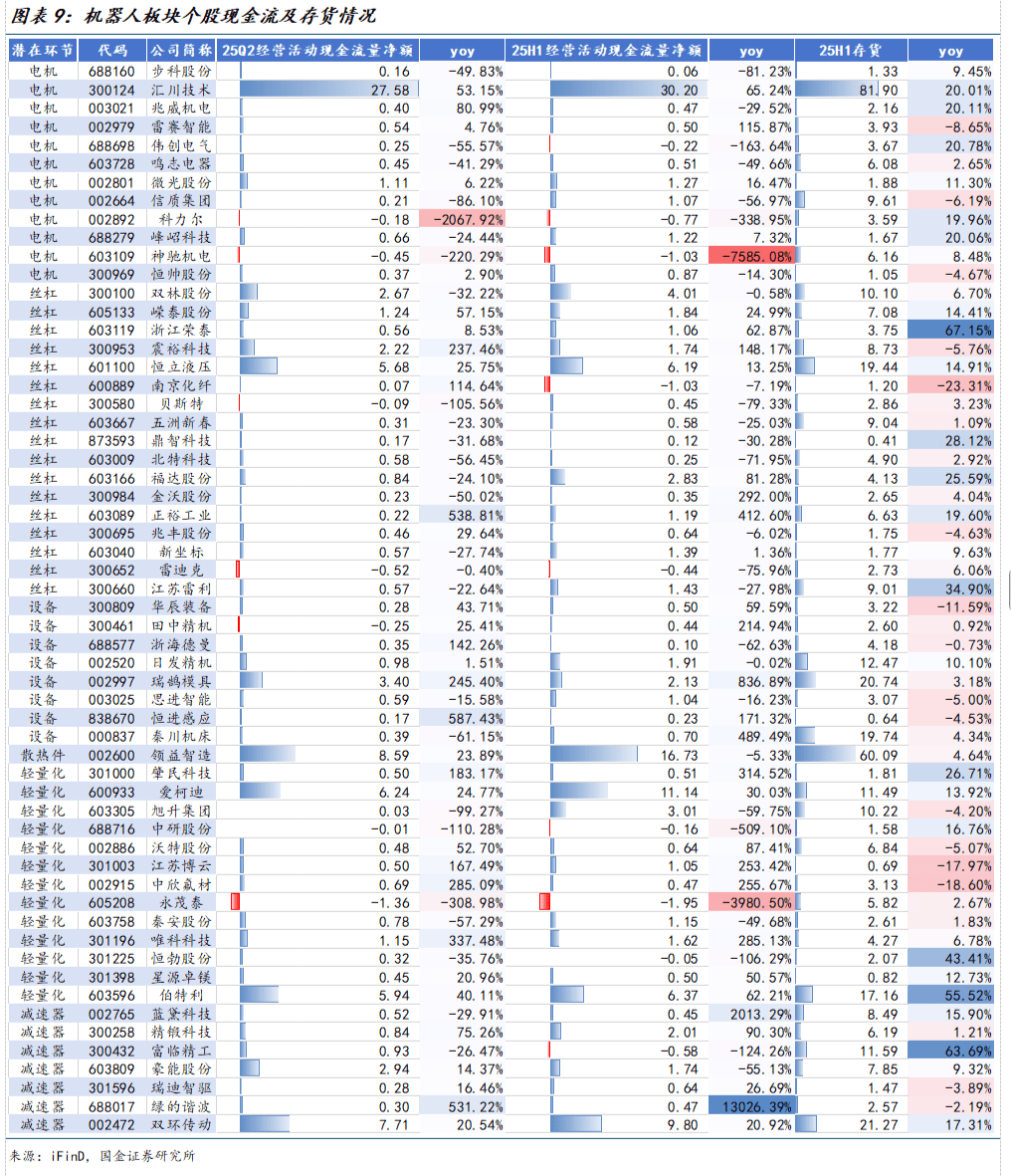 25H1机器人板块公司经营活动现金流量净额达240.14亿元,同比提升26.69%,其中汇川技术经营活动现金流量净额达到30.20亿元,同比增长65.24%。25H1末机器人板块公司存货达1102.26亿元,同比增长8.92%,其中均胜电子存货超百亿。25Q2机器人板块公司经营活动现金流量净额达174.92亿元,同比增长7.86%。