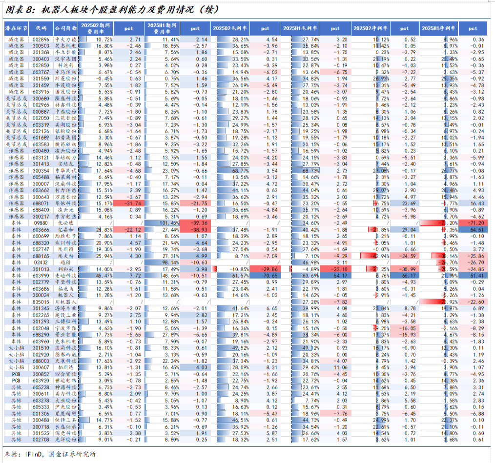 机器人板块标的主业毛利水平持续提升,费用率呈下降趋势。25H1机器人板块主业平均毛利率为21.94%(同比+0.10pct),净利率为7.48%(同比-0.01pct),期间费用率7.22%(同比-0.70pct)。25Q2机器人板块毛利率为22.19%(同比+0.31pct),净利率为7.42%(同比-0.55pct),期间费用率6.65%(同比-0.71pct)。分版块来看,核心零部件板块盈利能力最强,25H1毛利率达22.54%,净利率达9.31%。本体及总成板块标的主业降本效果凸显,毛利率上升趋势较为明显,设备板块净利率波动较大,期间费用率最高。从个股情况看,受主业盈利模式影响,25H1东华测试、麦迪科技毛利率最高,分别68.73%、63.69%,新坐标、峰岹科技两家企业净利率超30%。麦迪科技盈利能力提高明显,25H1毛利率提升54.17pct,净利率提升51.41pct。