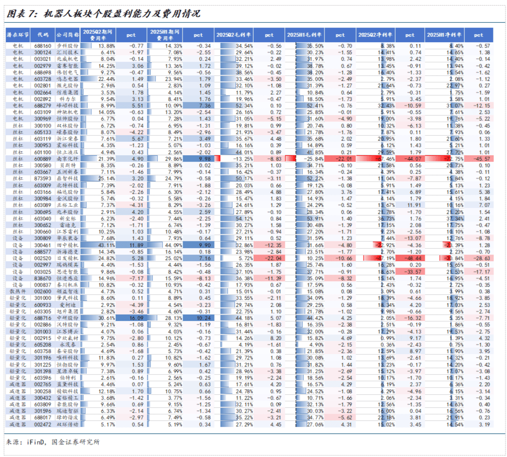 25H1机器人板块公司毛利率为21.94%,同比提升0.10pct,其中东华测试、麦迪科技毛利率最高,分别68.73%、63.69%,麦迪科技毛利率增长幅度最大,同比提升54.17pct。25H1机器人板块公司净利率为7.48%,同比下降0.01pct,其中新坐标、峰岹科技两家企业净利率超30%。25H1年机器人板块公司期间费用率为7.22%,同比下降0.70pct。2025Q2机器人板块公司毛利率达22.19%,同比提升0.31pct,净利率达7.42%,同比下降0.55pct,期间费用率为6.65%,同比下降0.71pct。