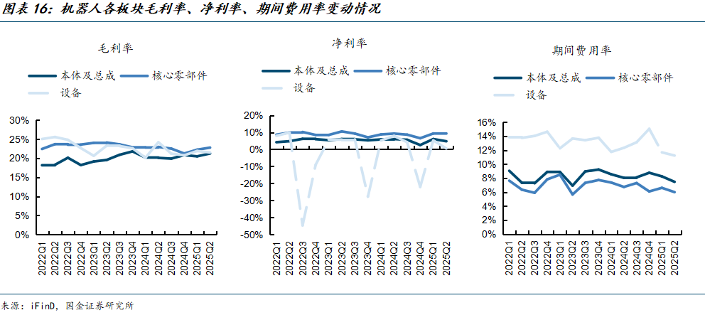 25Q2,本体及总成公司毛利率为21.26%,同比提升1.15pct,净利率为4.74%,同比下降1.31pct。核心零部件公司毛利率为22.80%,同比下降0.18pct,净利率9.34%,同比提升0.09pct。设备板块毛利率和净利率同比下降幅度较大,分别同比下降2.71pct和7.38pct。从期间费用率看,各板块均呈现下降趋势,本体及总成、核心零部件、设备板块公司期间费用率分别为7.46%、5.99%、11.22%,同比下降0.57pct、0.74pct、1.10pct。