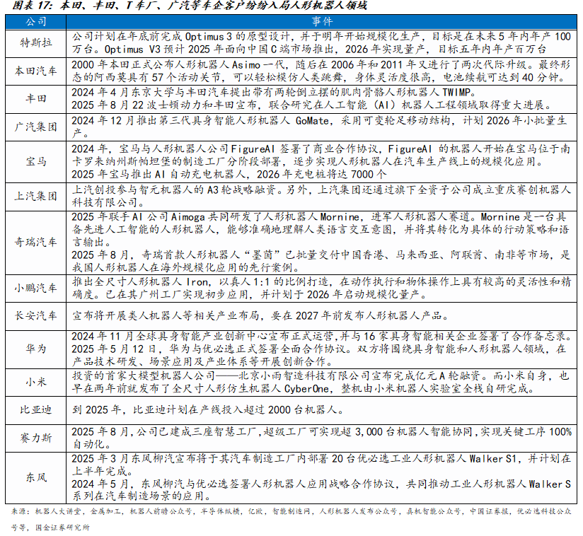 25H1汽车厂商纷纷跨界入局。在技术层面,车企在自动驾驶、人工智能等领域积累的深厚技术储备,为人形机器人的研发提供了强有力的支持。例如,广汽集团推出的GoMate机器人采用了自研的驱动器和电机,而小鹏汽车的人形机器人小鹏Iron则配备了多块自研芯片,T车厂成功将自动驾驶系统中的视觉、导航和AI算法技术应用于人形机器人中,并利用海量数据对机器人进行优化训练,提升其智能性与实用性。