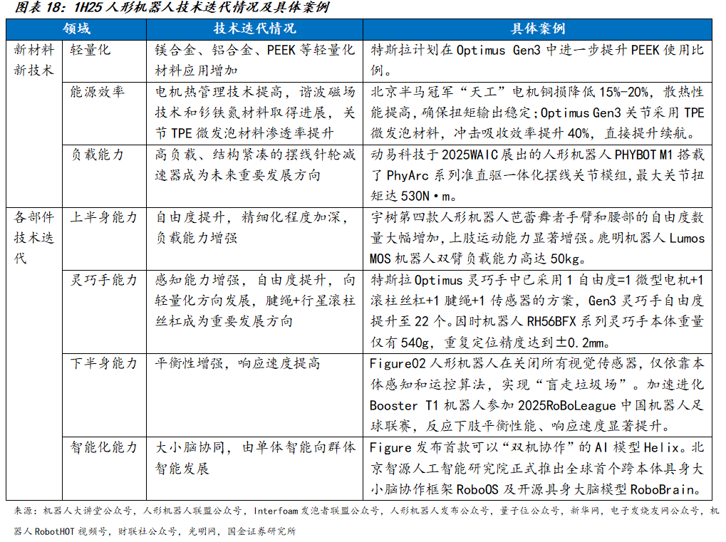 2025年上半年,机器人技术迭代速度显著加快。在新材料新技术方面,镁合金、铝合金、PEEK等轻量化材料应用增加,谐波磁场技术和钐铁氮材料取得进展,能源利用效率有所提升,摆线针轮减速器成为减速器重要发展方向。从各部件来看,上半身自由度显著增加,精细化程度加深,双臂负载能力增强;灵巧手自由度得以提升,感知能力增强,结构向轻量化紧凑化方向发展,同时腱绳+行星滚柱丝杠传动方案得到市场认可;下半身双足平衡性能得以提升,响应速度有所加快;在智能化方面,大小脑逐渐形成协同系统,并由单体智能向群体智能发展。