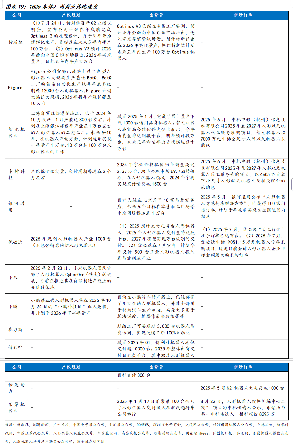 25H1机器人本体厂商获得订单数量持续增加,订单规模有所扩大,人形机器人商业化量产在即。其中,整机大订单情况如下:
