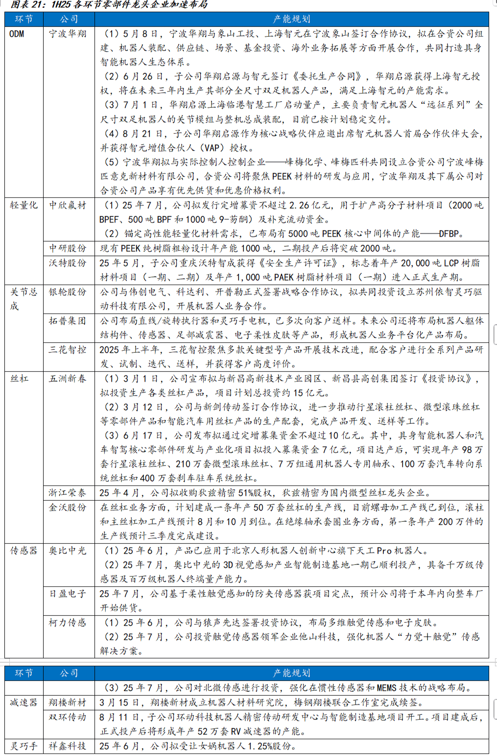 1H25,各环节零部件龙头企业加速布局人形机器人领域。宁波华翔已成为智元机器人ODM 厂商,为其代工“远征系列”机器人。轻量化方面,中欣氟材新发行定增2.26亿元扩产高分子材料项目,目前PEEK中间体DFBP产能已达5000吨。关节总成领域,银轮股份与开普勒等共同设立合资公司开展机器人业务合作。丝杠领域,五洲新春与新剑传动开展丝杠业务合作,浙江荣泰拟收购丝杠龙头狄兹精密51%股权。传感器领域,奥比中光3D视觉感知产业智能制造基地一期已顺利投产。减速器方面,翔楼新材成立机器人材料研究院,双环传动年产52万套RV减速器项目开工。