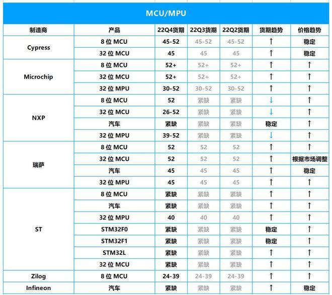 MCU/MPU等高端器件Q4货期基本延续Q3紧缺的态势,而且大部分产品的货期和价格呈上升趋势,缺货现象未见明显好转。