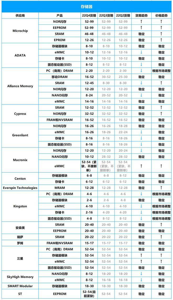 而Microchip和ST的EEPROM,目前供应还是比较紧张,货期均超过52周,三星、Cypress、Macronix等大厂也有部分存储产品交期较长。