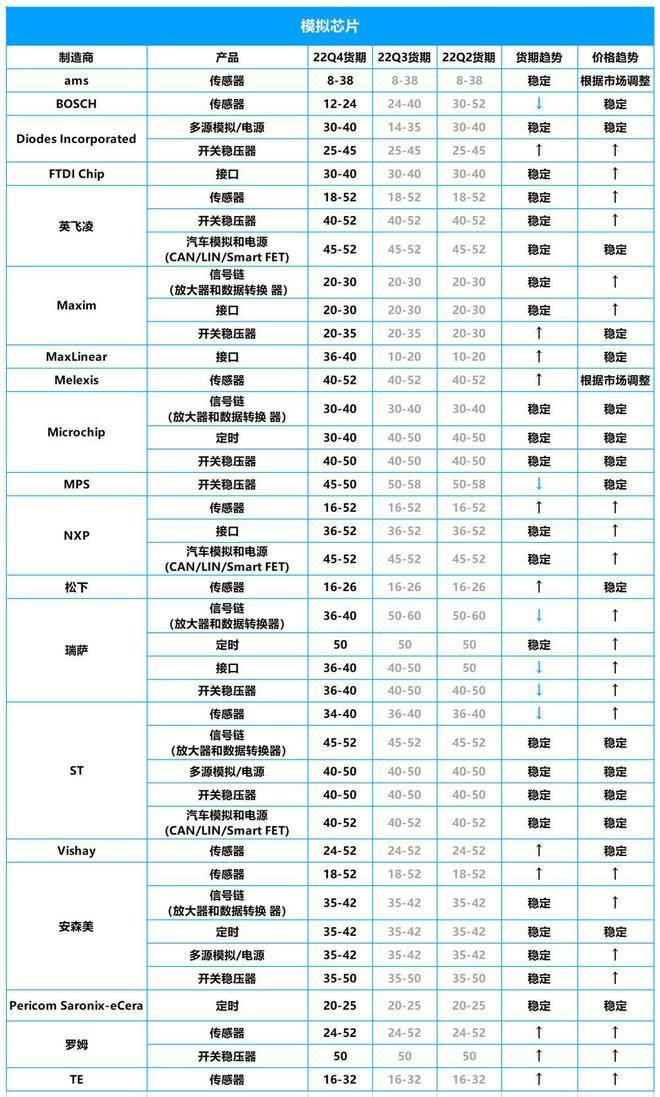 英飞凌的开关稳压器/汽车模拟和电源器件、Microchip的定时器和开关稳压器、ST的电源器件/开关稳压器/汽车模拟和电源器件等货期依然较长,货期最长仍可达50周以上。