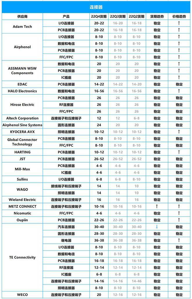 相对上个季度来说,连接器产品货期变化较有限,仅Adam Tech、WECO等个别厂商的产品货期有所延长,且延长时间不超过4周。