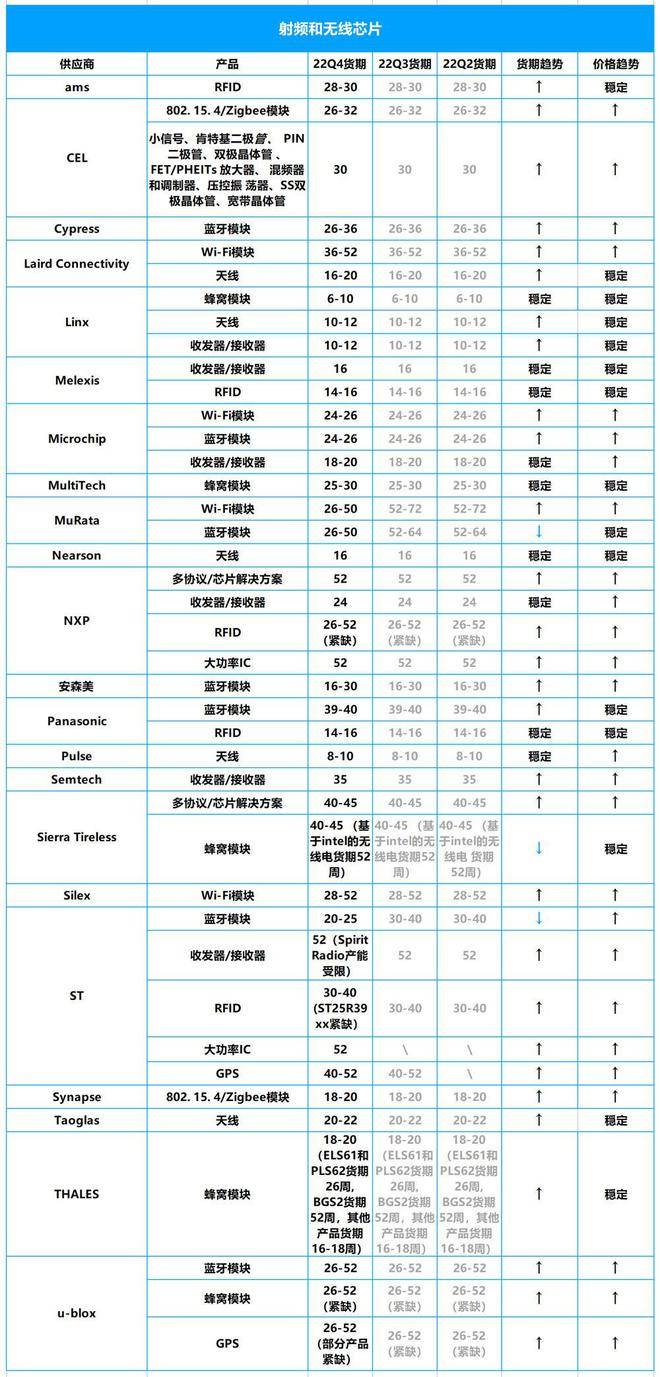 其中,GPS、Wi-Fi模块、蓝牙模块、大功率IC等产品货期仍没有缓解,MuRata、Sierra Wireless、ST、u-blox、NXP等厂商的产品货期最长均超过50周。
