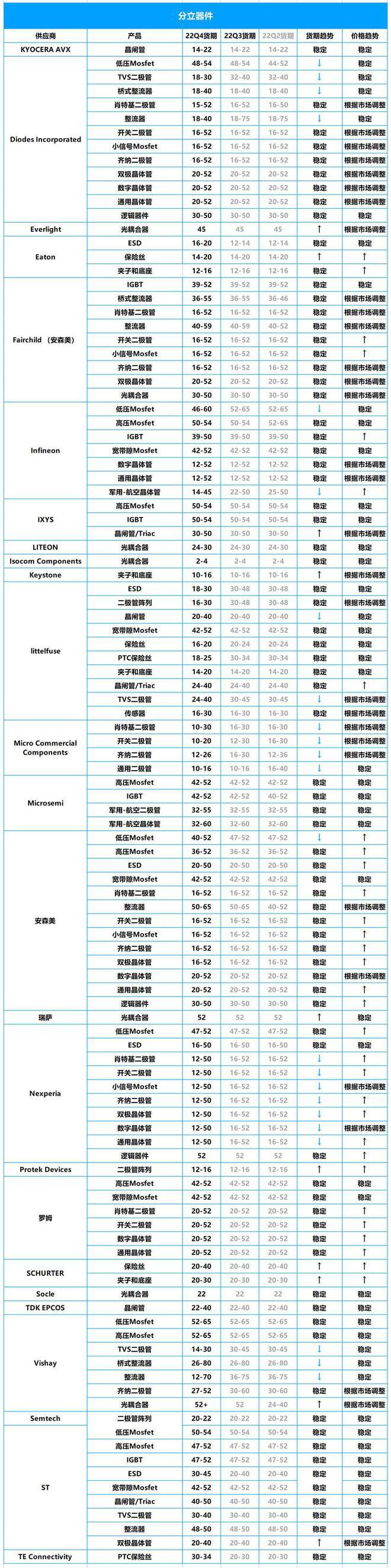 不过,安森美、英飞凌、Vishay、IXYS、凯发K8一触即发ST、ROHM、Microsemi等厂商的产品货期依然较长,货期最长均在50周以上。