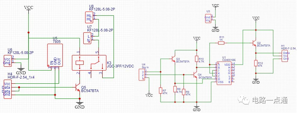 硬件逻辑纯粹是使用逻辑门构建的,更具体地说只是一堆或非门(它是通用的)。我们使用 CD4001 四或非门来开发我们的时序逻辑并构建电路。由于我们正在制造无线设备,因此我们使用简单的射频模块将开启或关闭信号发送到水泵。EasyEDA 用于设计PCB。